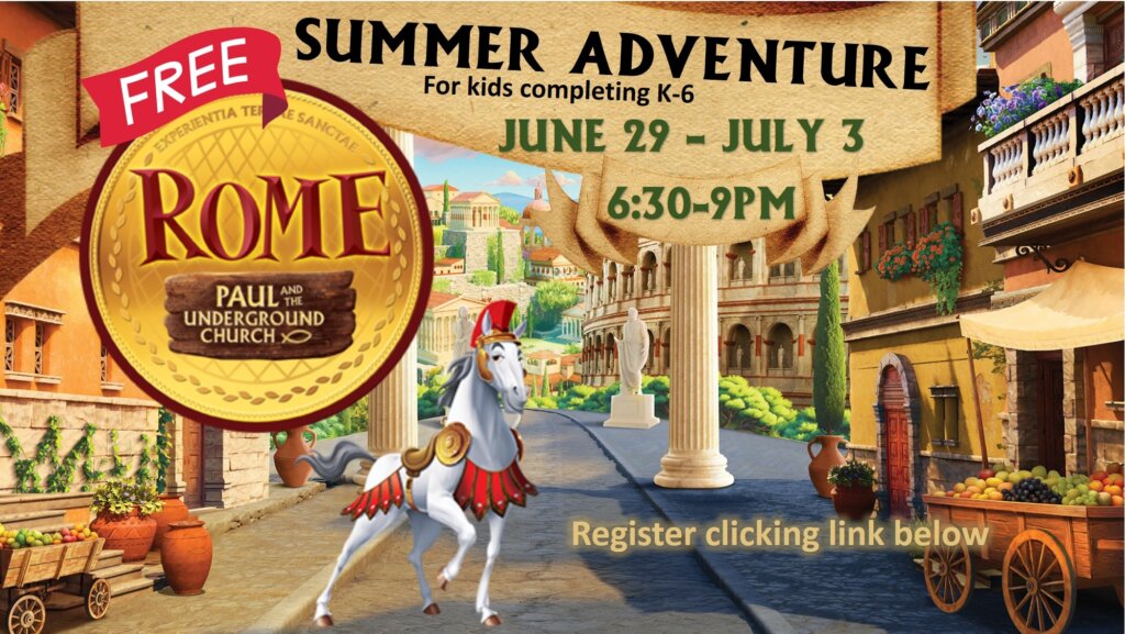 Great week is planned for kids completing K-6. Kids will take a trip to Ancient Rome and get a sense of what it was like when Paul established the church. There will be games, crafts, music and lots of fun! Register by clicking the link below